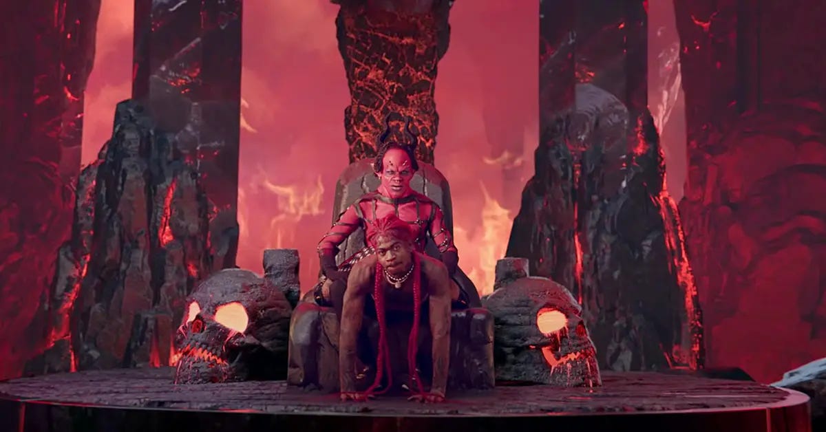Back to the devil, or Lil Nas. Everyone’s heard about Lil Nas’s shoes. He released (from its chains? Summoned from its pits?) 666 pairs of red-black Nikes complete with pentagrams, inverted crosses, and one drop of actual human blood in its ‘soles,’ priced at $1018, a reference to Luke 10:18 (“I saw Satan fall like lightning from heaven”). This is in addition to the buttfucking demon video, in which Nas, I best mention, descends from heaven to hell on a stripper pole.