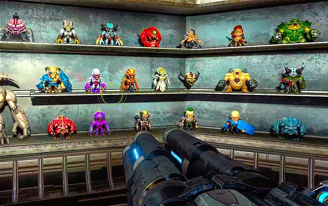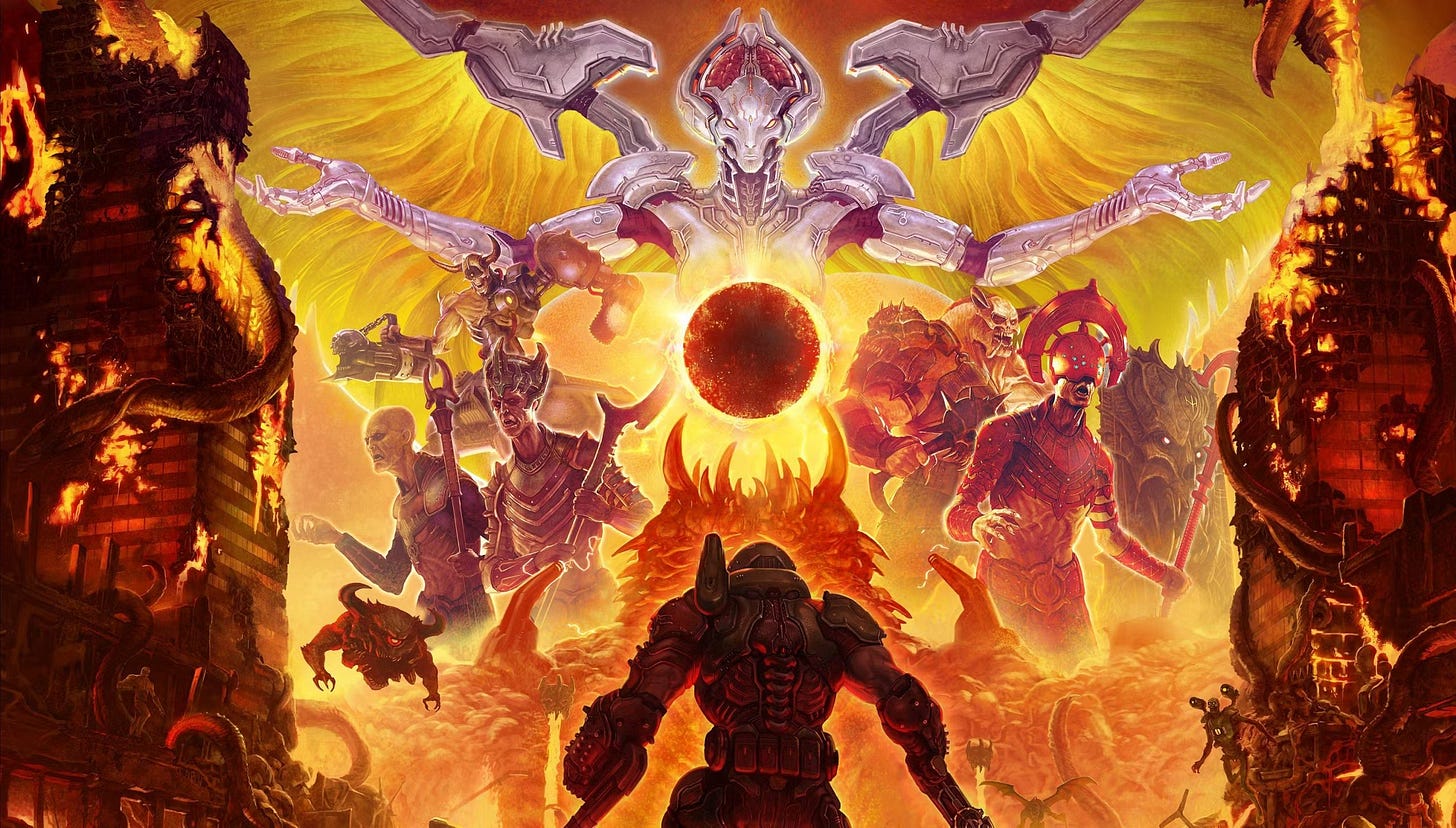 Something was off about the DOOM reboot—something in the funko pop doll in-game collectibles, the chirpy AI sidekick, the steady creep of lore, and how good the gameplay was, unconscionably good for anything that came out in the 2010s. It was the kind of good that felt plotted and deliberate, like it was aware of the creative bankruptcy of the industry and wanted to make a statement, but still a statement, still too aware of the shit surrounding it to be totally sincere.